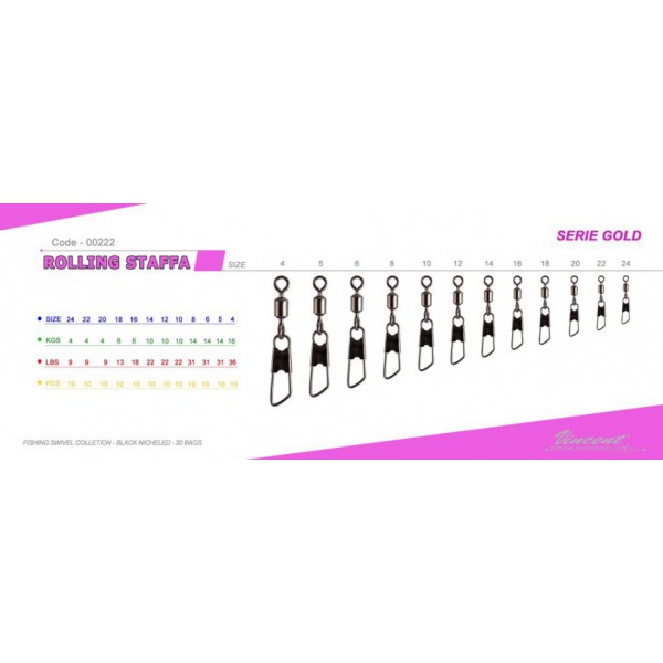 La Girella Rolling Staffa appartiene alla gamma di girelle ideate dalla Vincent, marchio italiano specializzato nella produzione di galleggianti e di altri accessori per la pesca.